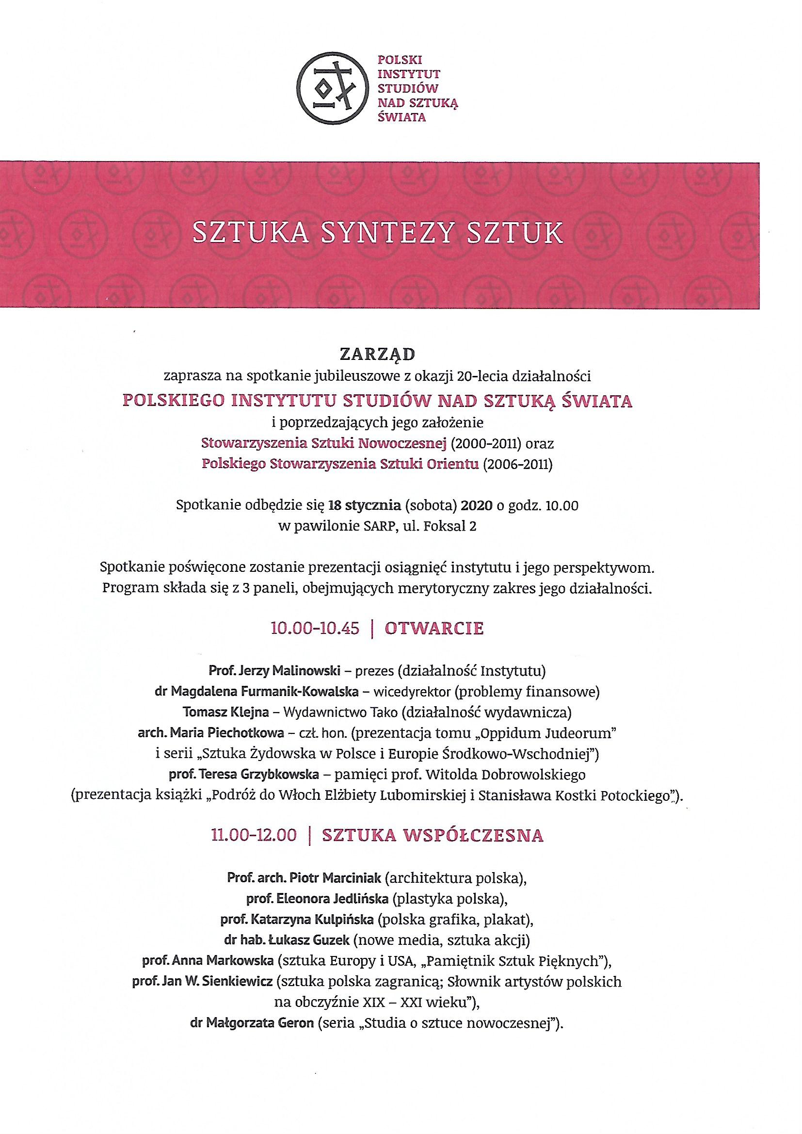 SZTUKA SYNTEZY SZTUK. SPOTKANIE JUBILEUSZOWE Z OKAZJI 20-LECIA DZIAŁALNOŚCI POLSKIEGO INSTYTUTU STUDIÓW NAD SZTUKĄ ŚWIATA I POPRZEDZAJĄCYCH JEGO ZAŁOŻENIE STOWARZYSZENIA SZTUKI NOWOCZESNEJ (2000-2011) ORAZ POLSKIEGO STOWARZYSZENIA SZTUKI ORIENTU (2006-2011)